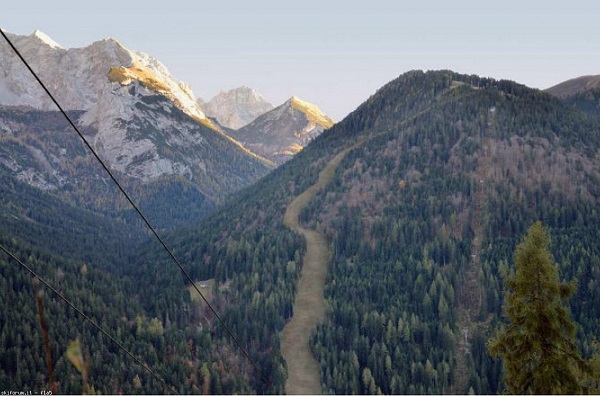 In fondo, il rendering della pista Puza dai fo’-Plaza (prolungamento della pista Brenta):