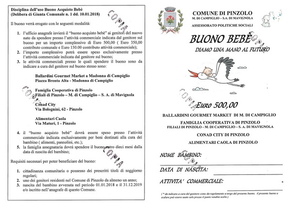 Visto il grande apprezzamento riscontrato l’anno scorso, il Comune di Pinzolo ha deciso, infatti, di proseguire con l’iniziativa “Buono acquisto bebè” anche per i prossimi due anni, raccogliendo nuovamente la grande sensibilità dei commercianti che già avevano aderito.