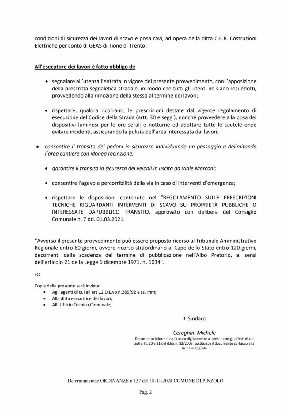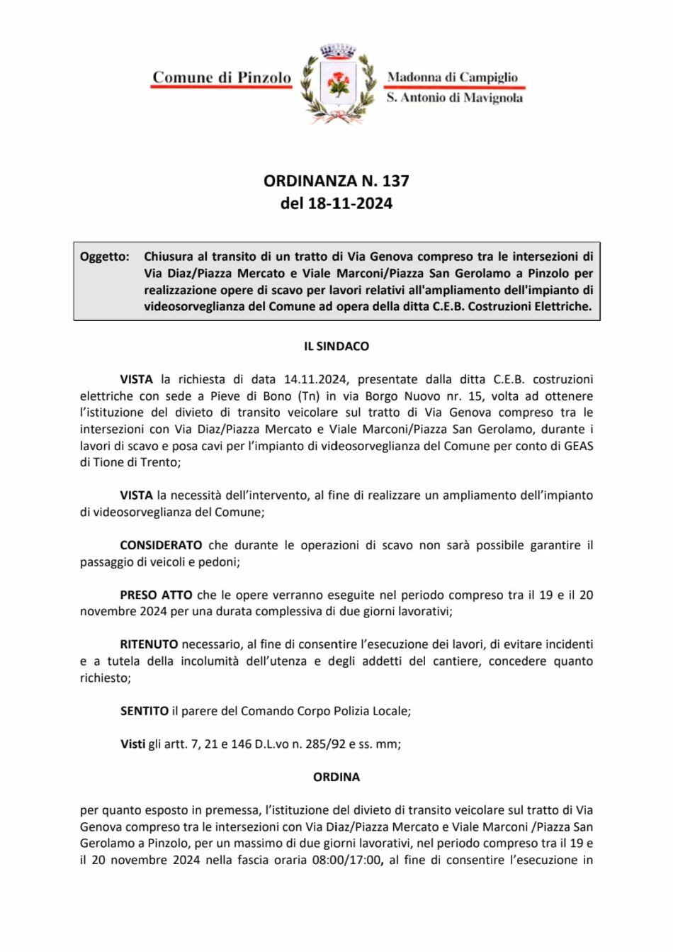 Chiusura al transito di un tratto di Via Genova compreso tra le intersezioni di Via Diaz/Piazza Mercato e Viale Marconi/Piazza San Gerolamo a Pinzolo per realizzazione opere di scavo per lavori relativi all’ampliamento dell’impianto di videosorveglianza del Comune ad opera della ditta C.E.B. Costruzioni Elettriche.