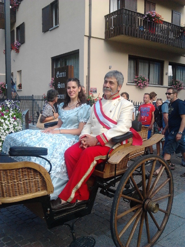 Un folto pubblico ha salutato ieri, 17 agosto, a Pinzolo il passaggio dell’imperatore Franz Joseph, accompagnato dalla consorte Sissi. L’amato regnante di casa Asburgo è stato interpretato in modo magistrale dall’attore spezzino di origini romane, Marco Masi, che da quasi 50 anni passa le vacanze nella nostra valle. Bellissima, nel suo costume turchese, l’imperatrice Sissi, interpretata da Liuba Maestranzi di Giustino.