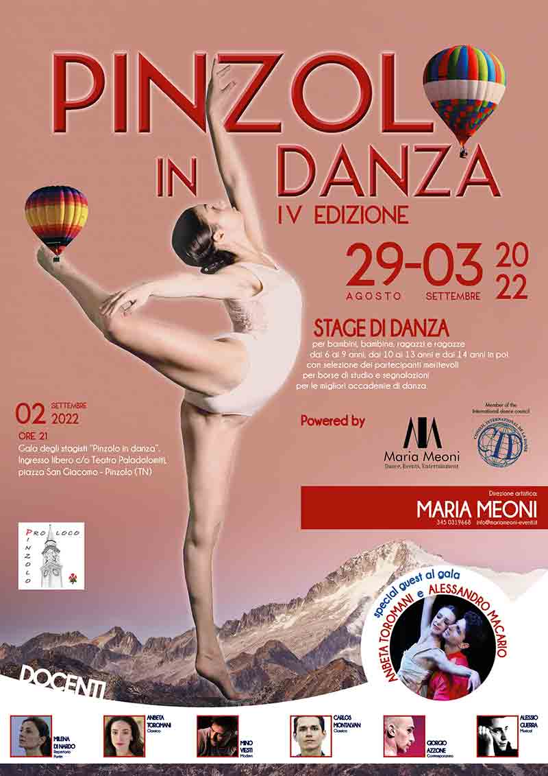 “Pinzolo in Danza”riunirà a Pinzolo tanti  ragazzi  guidati da docenti di fama internazionale. Special guest della, serata di galà al Paladolomiti saranno i ballerini Anbeta Toromani e Alessandro Macario.