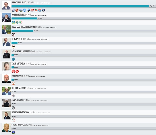 Trionfo della Lega a Pinzolo che, da sola, ottiene la maggioranza dei consensi (51,40). La coalizione a sostegno del presidente Maurizio Fugatti ha superato il 70% dei voti. Un risultato al di sopra delle più rosee previsioni. Più di 600 le preferenze a Pinzolo per Roberto Failoni che, con più di 2.300 voti a livello provinciale, risulta secondo come preferenze tra i 13 eletti della Lega Salvini Trentino (con l’aggiunta del Presidente Maurizio Fugatti). Il PATT ottiene il 11,15% dei voti, il PD il 7,85%, Civica Trentino il 6,36%, Forza Italia (Bruna Cunaccia) il 6,23% e Agire per il Trentino (Sergio Binelli) l’ 1,56%.