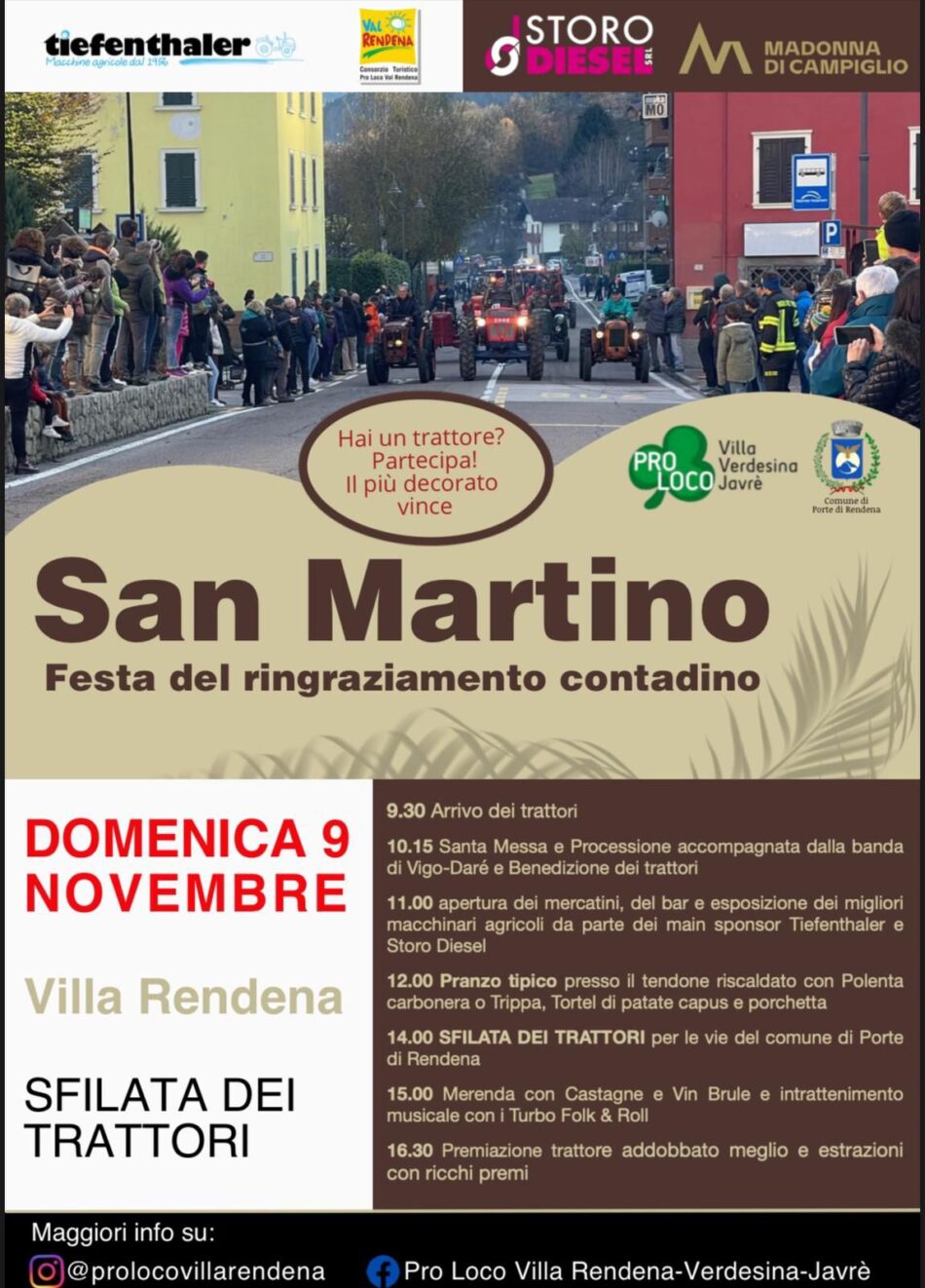 In occasione delle celebrazioni del patrono, il Comune di Porte di Rendena, in collaborazione con la Pro Loco Villa Verdesina-Javrè, il Comitato San Martino e le associazioni locali, invita tutta la popolazione a partecipare ai festeggiamenti.