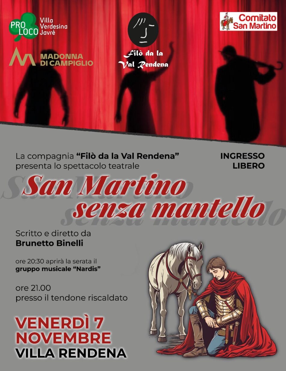 Gli appuntamenti prenderanno il via venerdì 7 novembre con lo spettacolo teatrale “San Martino senza mantello”, scritto e diretto da Brunetto Binelli e portato in scena dalla compagnia Filò da la Val Rendena. L’appuntamento è fissato per le ore 21 presso il tendone riscaldato di Villa Rendena, con ingresso libero. La serata sarà aperta, alle 20.30, dal gruppo musicale Nardis.