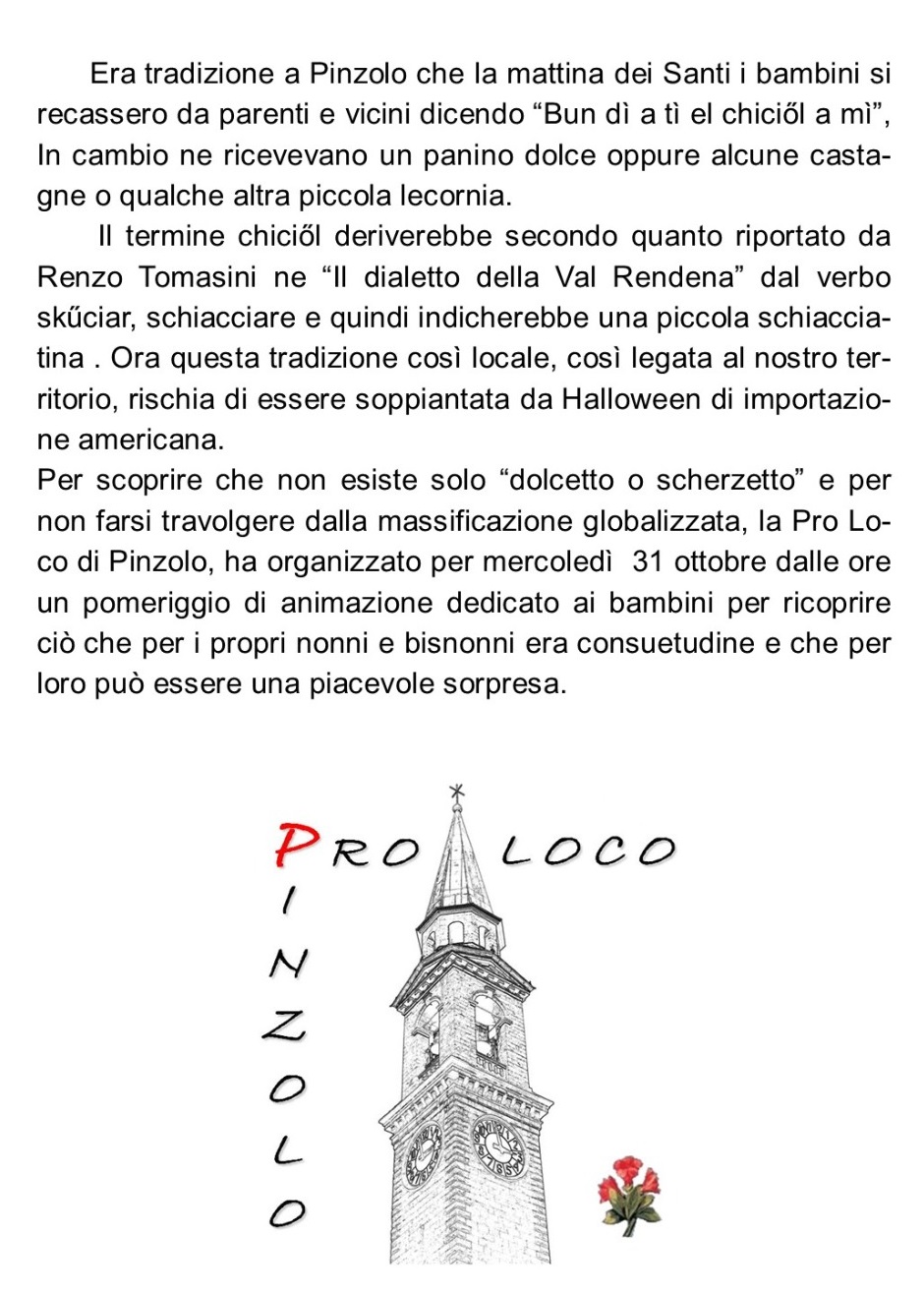 Non esiste solo “dolcetto o scherzetto” ma anche “Bundì a tì el chiciöl a mi“. E allora le “vulcaniche menti” di Carla Maturi e Sandro Ducoli della Pro Loco di Pinzolo hanno pensato di organizzare, in collaborazione con la Pro Loco di Mavignola, la Festa dal Chiciöl, un pomeriggio di animazione dedicato ai bambini per riscoprire ciò che per i propri nonni e bisnonni era consuetudine e che per loro può essere una piacevole sorpresa.