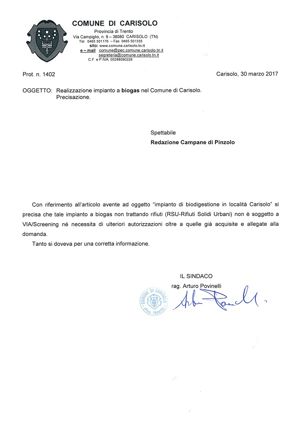 • Precisazione sulla realizzazione dell’impianto a biogas
