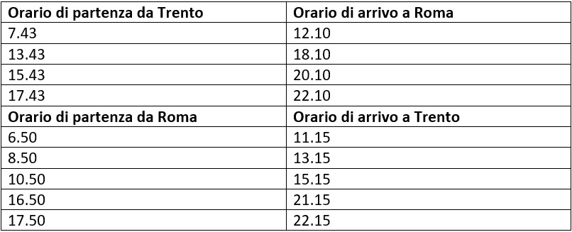 Ecco gli orari di partenza dei treni FrecciaRossa e FrecciaArgento di Trenitalia che giornalmente collegano Roma (e Firenze) a Trento (durata del viaggio circa 4 ore 25’):