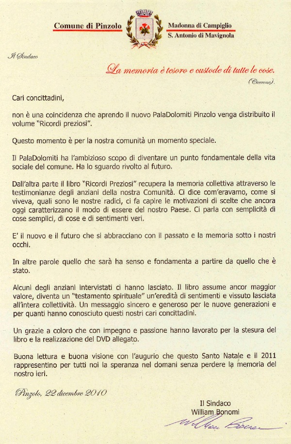 La lettera del Sindaco di Pinzolo