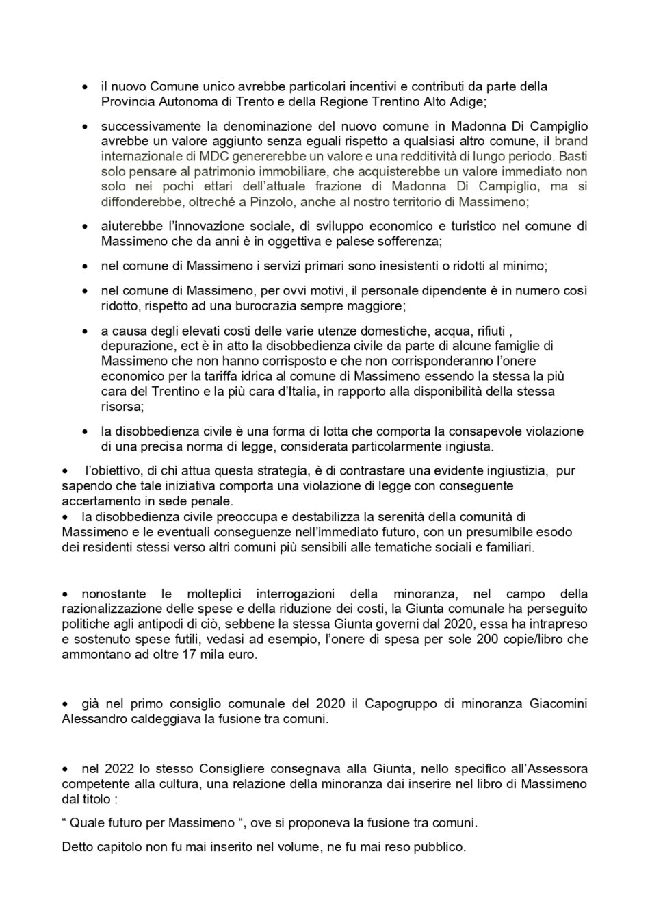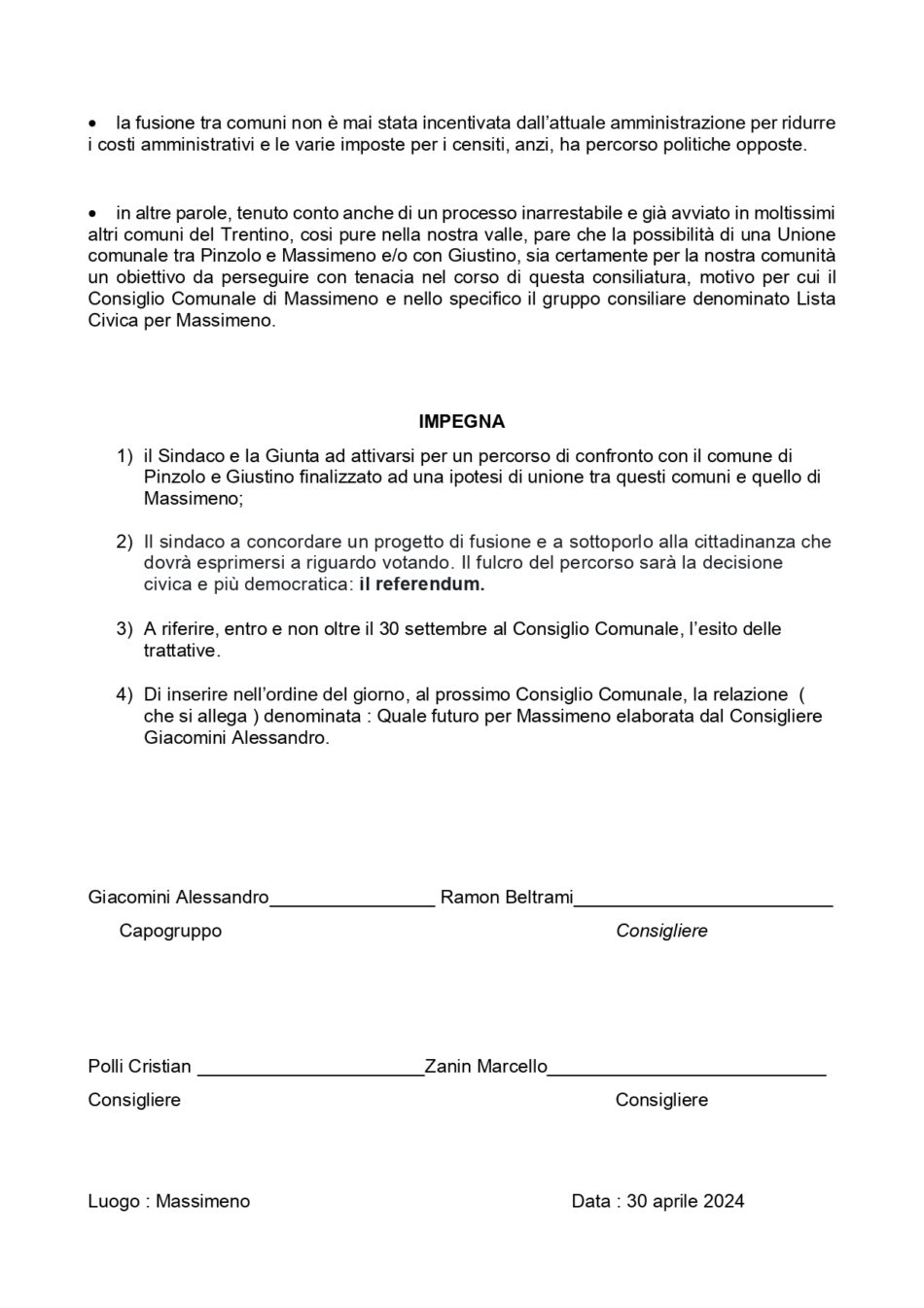 In conclusione, per il futuro abbiamo due opzioni, l’unione tra comuni è certamente, per la comunità di Massimeno, un obiettivo da perseguire con tenacia, l’altra è restare tali ma l’immobilità è un lusso che non possiamo più permettercelo.