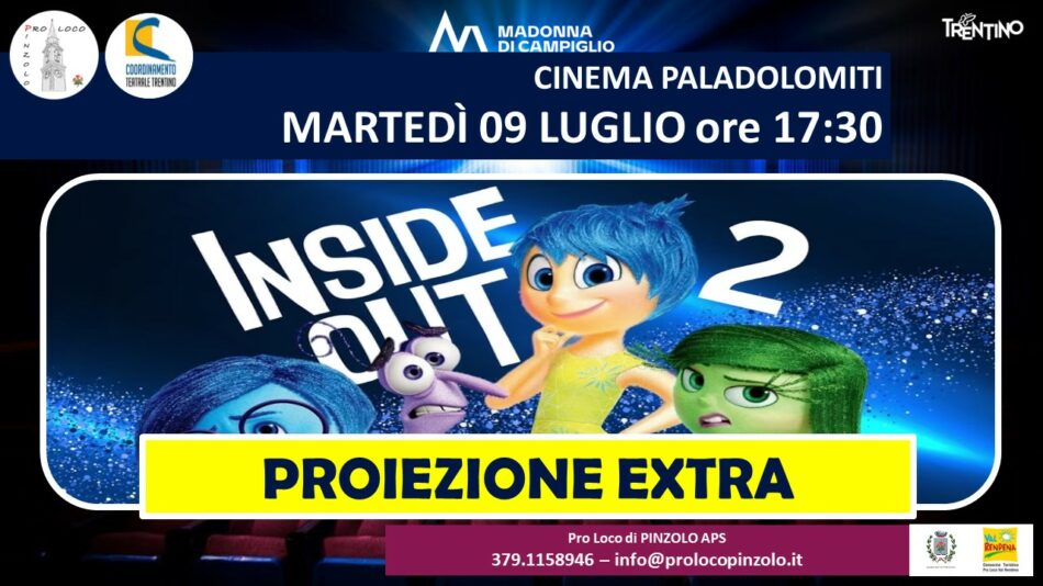 “Inside Out 2” ha superato ieri in Italia i 37 milioni di euro, battendo il film di Cortellesi  come miglior incasso stagionale. E anche a Pinzolo il film di animazione della Disney Pixar sta riscuotendo uno straordinario successo di pubblico, con più di 700 spettatori paganti in due sole proiezioni. Per andare incontro alle richieste (ieri almeno duecento persone sono rimaste fuori), la Pro Loco ha programmato una proiezione EXTRA per domani pomeriggio (9 luglio), sempre alle 17.30 al Paladolomiti.