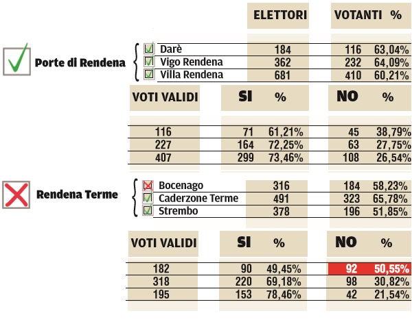 Ieri 45.783 elettori trentini di 55 Comuni sono stati chiamati a pronunciarsi su 19 fusioni comunali. Grande attesa anche in Val Rendena: a Darè, Vigo Rendena e Villa Rendena (Porte di Rendena) e Bocenago, Caderzone e Strembo (Rendena Terme). Schiacciante la vittoria dei SI alla fusione nei Comuni della bassa Rendena mentre a Bocenago, il “no” ha infatti avuto la meglio per appena 2 voti, 92 a 90.