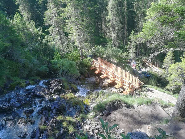 “Le passerelle – prosegue Corradi – presentavano diversi punti di marcescenza, inoltre, il fondo del sentiero era in diversi passaggi malagevole e invaso dalle radici degli alberi. In questo caso, il lavoro è stato eseguito dalla ditta Povinelli Vincenzo di Carisolo che ha vinto la gara. Sono state rifatte sette passerelle integralmente in larice al naturale, dalle travi portanti a ogni componente. Cinque sono posizionate sulle sorgenti e altre due più piccole per completare il percorso, dove il sentiero si interrompe. Sono poi stati rifatti i parapetti nei punti più pericolosi. Sono stati realizzati dei gradini in legno e in pietra, per superare tratti impervi, mentre alcune scale e gradini in cattivo stato sono stati sostituiti. Questo intervento è stato possibile grazie al finanziamento di 95.000 euro del Servizio Turismo della Provincia autonoma di Trento.”.