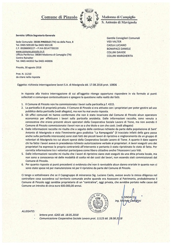 Risposta interrogazione lavori a S.A. di Mavignola dd. 17.08.2018