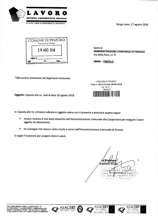 • Risposta interrogazione lavori a S.A. di Mavignola dd. 17.08.2018