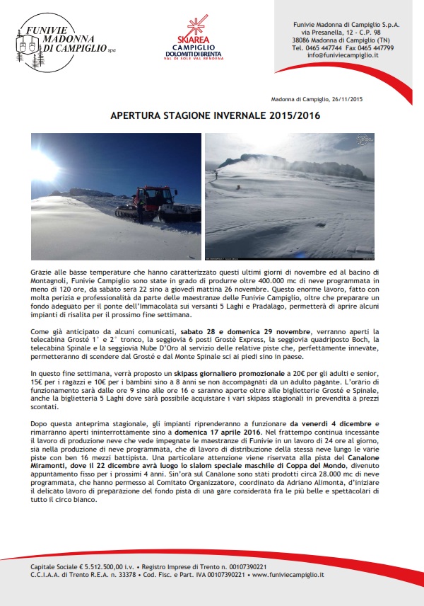 Comunicato della Società Funivie Campiglio