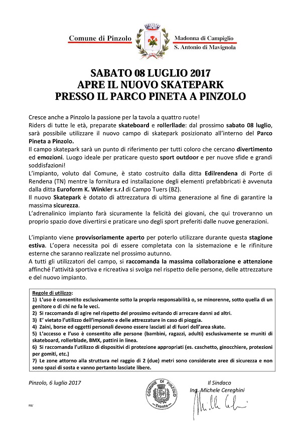 • Sabato 8 luglio si inaugura il nuovo Skatepark