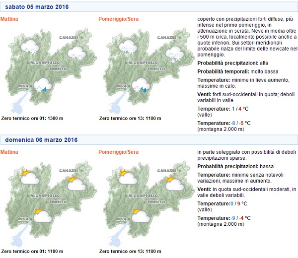 Sabato precipitazioni diffuse ad iniziare dai settori sud-occidentali nel primo mattino per poi estendersi a tutto il territorio ed intensificarsi nelle ore centrali della giornata; i fenomeni saranno poi in graduale esaurimento in serata. Nevicate mediamente oltre 500 m circa, localmente possibili anche a quote inferiori. Valori cumulati significativi previsti oltre 800-1000 m dove sono attesi mediamente tra 30 e 50 cm.