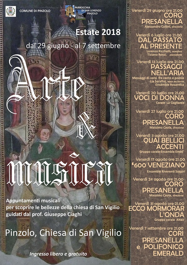 Dopo il successo dello scorso anno viene riproposta la rassegna Arte & Musica presso la Chiesa di San Vigilio a Pinzolo. Lo schema degli appuntamenti, che ha trovato ottimo gradimento da parte del pubblico, prevede accanto all’esibizione di una corale o di un ensamble, l’ intervento del prof. Giuseppe Ciaghi che illustra di volta in volta un particolare aspetto artistico o architettonico o storico del prezioso edificio sacro.