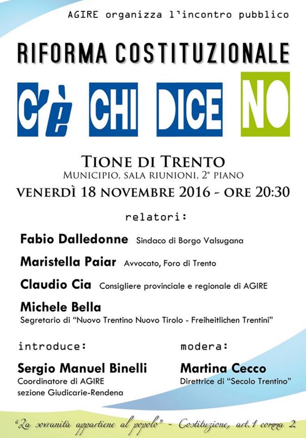 La popolazione delle Valli Giudicarie e Rendena è invitata a partecipare all’incontro pubblico organizzato da AGIRE per il Trentino sulla Riforma Costituzionale (“C’è Chi Dice NO”) che si terrà questo venerdì 18 novembre 2016, alle ore 20:30, presso il Municipio di Tione di Trento (sala delle Riunioni, 2° piano).
