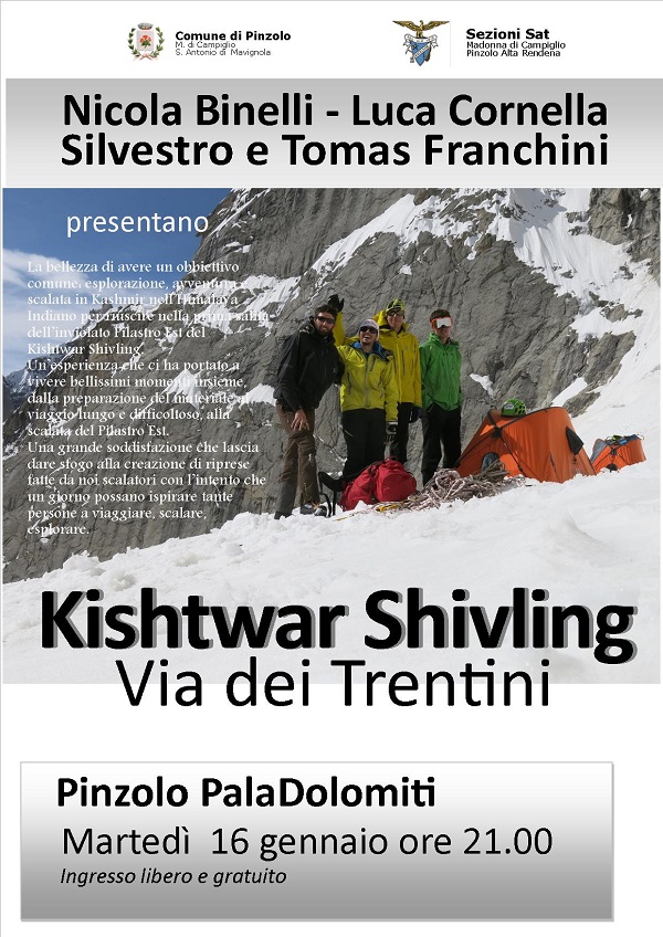 I 4 alpinisti vogliono raccontare con tutto il loro contagioso entusiasmo martedì sera 16 gennaio alle ore 21.00 presso il PalaDolomti di Pinzolo la bellezza di quest’impresa: avere un obiettivo comune, esplorare, vivere l’avventura e scalare in Kashmir nell’Himalaya Indiano fino a riuscire a salire per primi il Pilastro Est del Kishtwar Shivling.