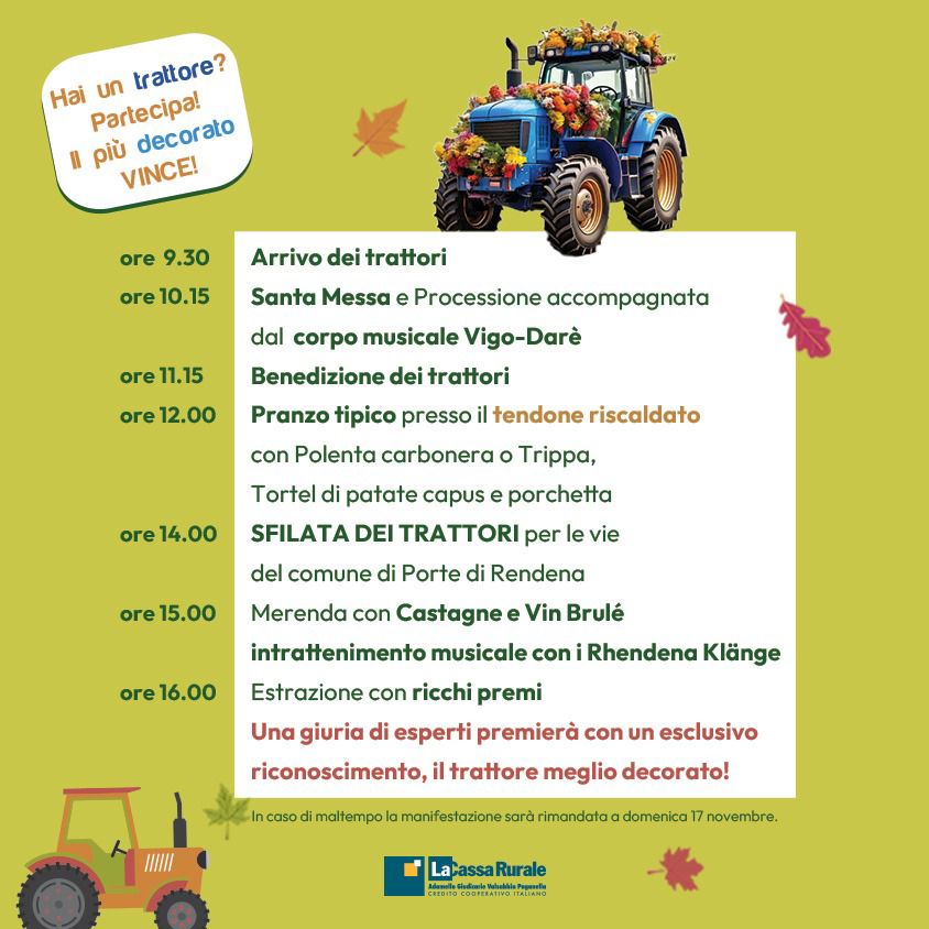 Ecco il programma. ore 9.30 arrivo dei trattori; ore 10.15 messa e processione accompagnata dal corpo musicale Vigo – Darè; ore 11.15 benedizione dei trattori; ore12.00 pranzo tipico presso il tendone riscaldato con polenta carbonera o trippa, tortel di patate capus e porchetta; ore 14.00 sfilata dei trattori per le vie del comune di Porte di Rendena; ore 15.00 merenda con castagne e vin brulé; intrattenimento musicale coi Rhendena Klänge; ore16.00 estrazione con ricchi premi. Una giuria di esperti premierà, con un esclusivo riconoscimento, il trattore meglio decorato.