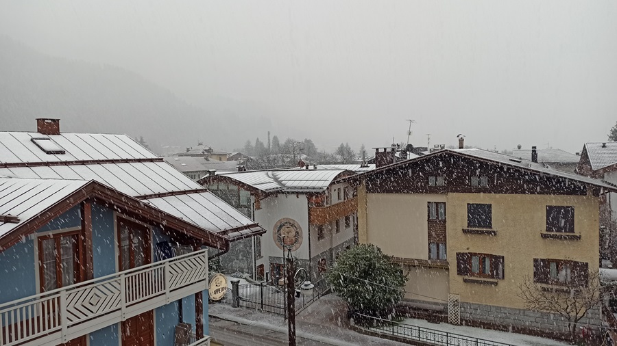 Come previsto da giorni una intensa perturbazione sta interessando la nostra zona. Dalla tarda notte una fitta nevicata in quota che dovrebbe portare più di mezzo metro di neve fresca. La quota neve si è abbassata e a Pinzolo sta cadendo (mattinata di domenica 10 marzo 2024) acqua mista a neve. Appena sopra il paese gli alberi sono già leggermente bianchi.