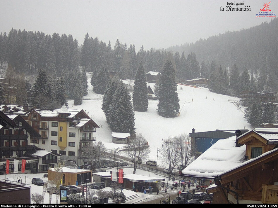 Come  previsto, dalla mattinata di oggi, venerdì 5 gennaio, sta nevicando sulla skiarea Campiglio, fino a quote relativamente basse. A Pinzolo paese è nevischio misto a pioggia. Nel pomeriggio le precipitazioni saranno più intense e soprattutto nel corso della serata e nella notte; limite neve perlopiù oltre i 1000 m ma a tratti localmente anche più in basso specie a nord e nelle valli alpine. Domani le precipitazioni saranno in lieve attenuazione al mattino a ovest; nel corso del pomeriggio e in serata nuova fase perturbata. Domenica deboli precipitazioni al mattino, forte vento da nord in quota e in alcune valli. Lunedì parzialmente soleggiato e ancora ventoso con temperature in calo. Martedì e mercoledì perlopiù soleggiato e fresco.