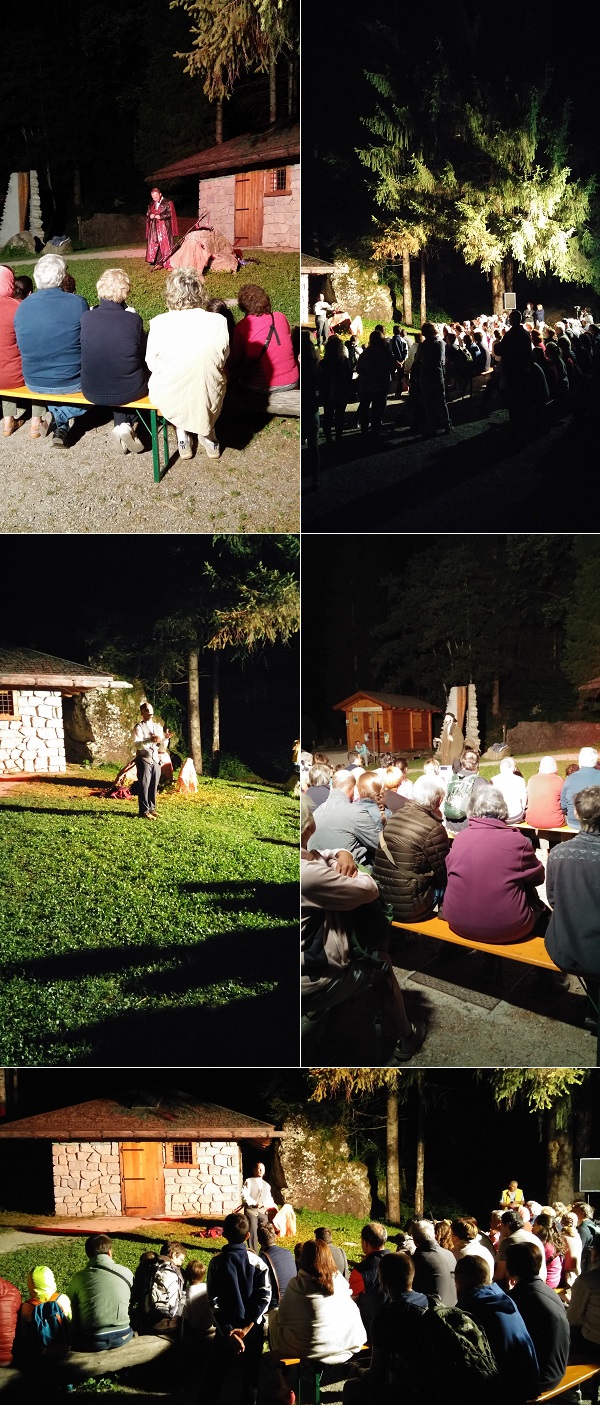Ieri sera, giovedì 6 agosto, ho assistito a "E uscimmo a riveder le stelle", evento itinerante che si è concluso al cospetto delle cascate Nardis. Dell’affascinante spettacolo mi ha colpito soprattutto il monologo scritto da Bruno Binelli e magistralmente interpretato da Alberto Gamberini, affermato attore teatrale milanese. In un angolo suggestivo della valle, nei pressi del ponte Verde, con un azzeccato gioco di luci e musiche, l’attore ha regalato agli spettatori un quarto d’ora di vera emozione, toccando i quattro temi che coinvolgono la val di Genova: la leggenda delle streghe, Fantoma e la caccia all’orso, le conquiste alpinistiche e la tragedia della Grande Guerra. Al termine, il folto e interessato pubblico si è recato alle cascate Nardis per assistere alla rappresentazione finale con lo spettacolo di luci e acqua.