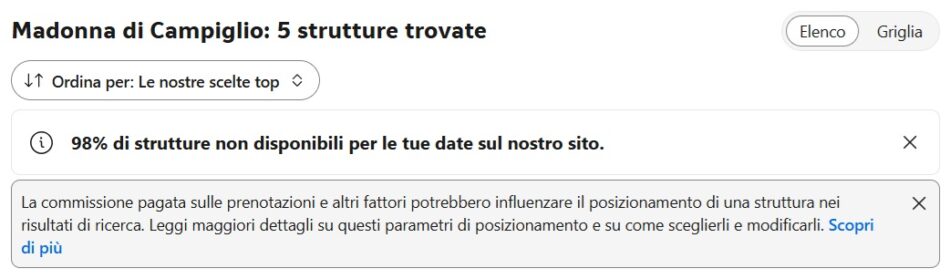 Strutture non disponibili in Booking per il prossimo fine settimana: 98% a Madonna di Campiglio e 97% a Pinzolo!