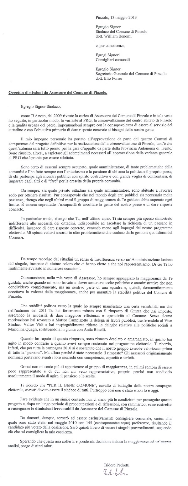 Lettera di dimissioni dell’Assessore Isidoro Pedretti