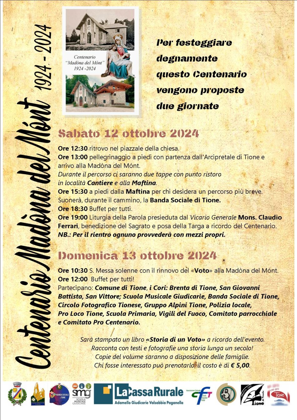 I festeggiamenti avranno inizio sabato 12 ottobre, dove alle ore 12:30 ci sarà il ritrovo nel piazzale della chiesa. La partenza del pellegrinaggio avverrà alle 13:00 dall’Arcipretale per arrivare alla Madòna del Mónt. Durante il percorso ci saranno due tappe con punto ristoro al “Cantiere” e alla “Maftina” da quest’ultima località presumibilmente alle 15:30 partirà – dopo essersi congiunto con il “gruppone” salito da Tione – la tappa più breve – riservata alle persone più anziane che desiderano partecipare.