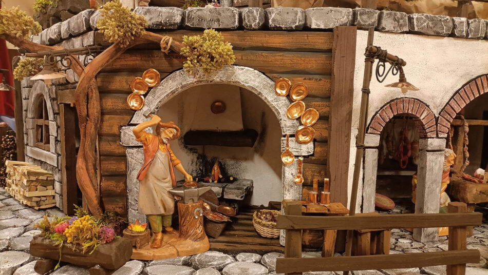 «Luce di speranza» è il titolo dell’opera presepistica a tutto tondo ed è proprio il caso di dirlo, poiché la struttura piramidale – su tre piani – è disseminata di numerose ambientazioni di negozianti, artigiani e commercianti, visibili a 360°. Il presepe di quest’anno prende ispirazione dalle abitazioni di Matera dove animali e persone vivevano insieme in un contesto poverissimo, ma felice e dove ognuno, col proprio lavoro, aiutava la comunità.