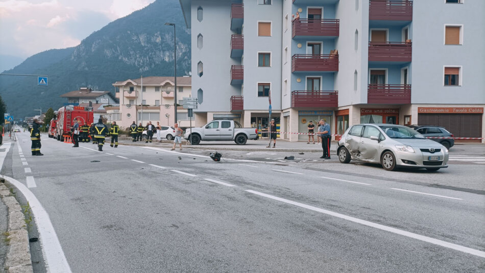 Questa sera a Tione erano da poco passate le 19:30 e uno scontro violentissimo si è consumato sulla via circonvallazione all’altezza dell’incrocio con via Legione Trentina tra una moto Yamaha di grossa cilindrata e una vettura Toyota. Allertati i vigili del fuoco di Tione sono immediatamente accorsi e nella dinamica ricostruita insieme ai carabinieri si è potuto constatare che l’automobilista della Toyota proveniva dalla via Legione Trentina e senza fermarsi alla stop attraversava la via circonvallazione mentre proveniva per andare verso la Rendena a forte velocità la moto che non ha potuto evitare l’impatto talmente violento che la vettura si è girata su se stessa e la moto nell’urto si è spezzata in tre pezzi scaraventando il centauro ad una trentina di metri.