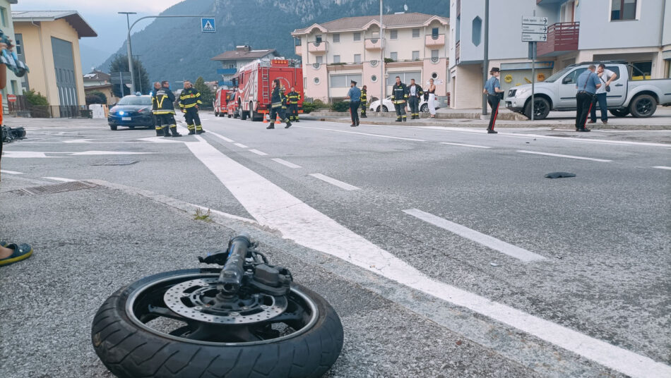 Questa sera a Tione erano da poco passate le 19:30 e uno scontro violentissimo si è consumato sulla via circonvallazione all’altezza dell’incrocio con via Legione Trentina tra una moto Yamaha di grossa cilindrata e una vettura Toyota. Allertati i vigili del fuoco di Tione sono immediatamente accorsi e nella dinamica ricostruita insieme ai carabinieri si è potuto constatare che l’automobilista della Toyota proveniva dalla via Legione Trentina e senza fermarsi alla stop attraversava la via circonvallazione mentre proveniva per andare verso la Rendena a forte velocità la moto che non ha potuto evitare l’impatto talmente violento che la vettura si è girata su se stessa e la moto nell’urto si è spezzata in tre pezzi scaraventando il centauro ad una trentina di metri.