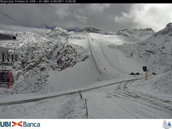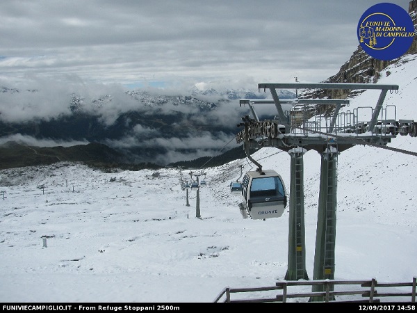 Il transito di una veloce perturbazione ha portato di nuovo la neve sulle cime intorno a Pinzolo, questa volta a quote più basse rispetto a domenica scorsa. Ed è tornata la neve al passo Grostè. E’ la seconda nevicata di questo fine estate. E i primi fiocchi d neve sono caduti stamattina anche al Doss del Sabion. Speriamo sia una buona premessa per l’imminente stagione invernale. Da domani le correnti tenderanno a disporsi da nord-ovest determinando condizioni di tempo più stabile e soleggiato. Giovedì e venerdì le correnti si disporranno da ovest portando variabilitÁ , mentre, purtroppo, è attesa una nuova perturbazione atlantica per il fine settimana.