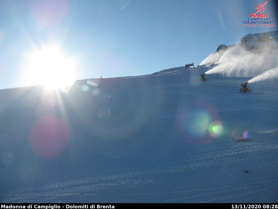 Questa notte sono tornati a sparare i cannoni nella skiarea Campiglio, ma solo nella parte alta del Grostè. Nella notte la temperatura è tornata sotto lo zero ma soltanto al di sopra dei 2.000 metri di quota. Ecco le immagini delle webcam al Grostè di stamattina, 13 novembre 2020.