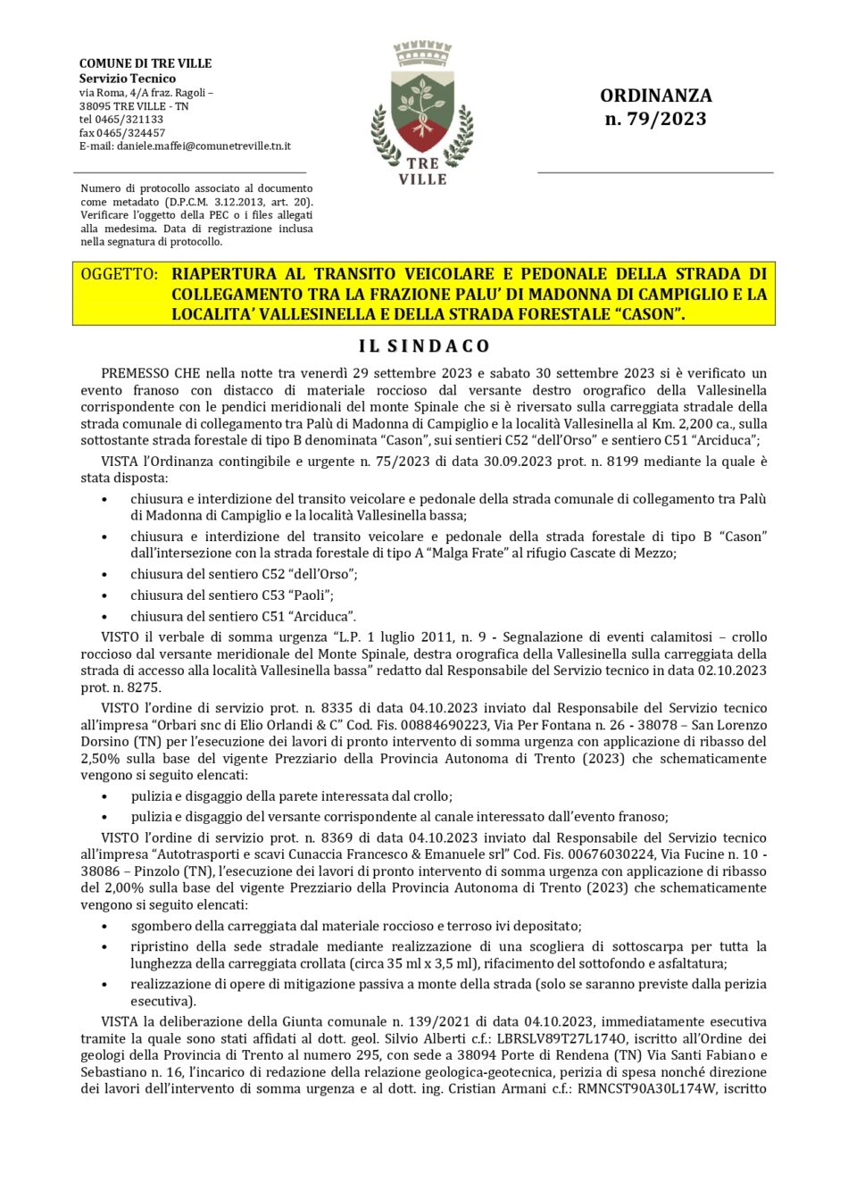 • Tre Ville: Ordinanza apertura strada Vallesinella