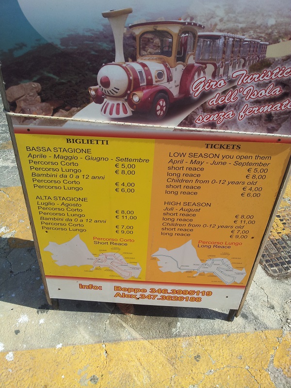 Li invito a guardare la foto che ho scattato a fine luglio a Favignana (isole Egadi). Faccio presente che la lunghezza totale dell’isola è pari a circa la distanza che c’è tra Pinzolo e Spiazzo Rendena. Pertanto il “Percorso Corto” corrisponde pressapoco al tragitto del trenino che collega i paesi dell’Alta Rendena. Anche lì il servizio non è gratuito (biglietto per il Percorso Corto pari a 5 euro in bassa stagione e 8 euro in luglio-agosto) come, purtroppo, lo è stato per troppi anni in Rendena !!