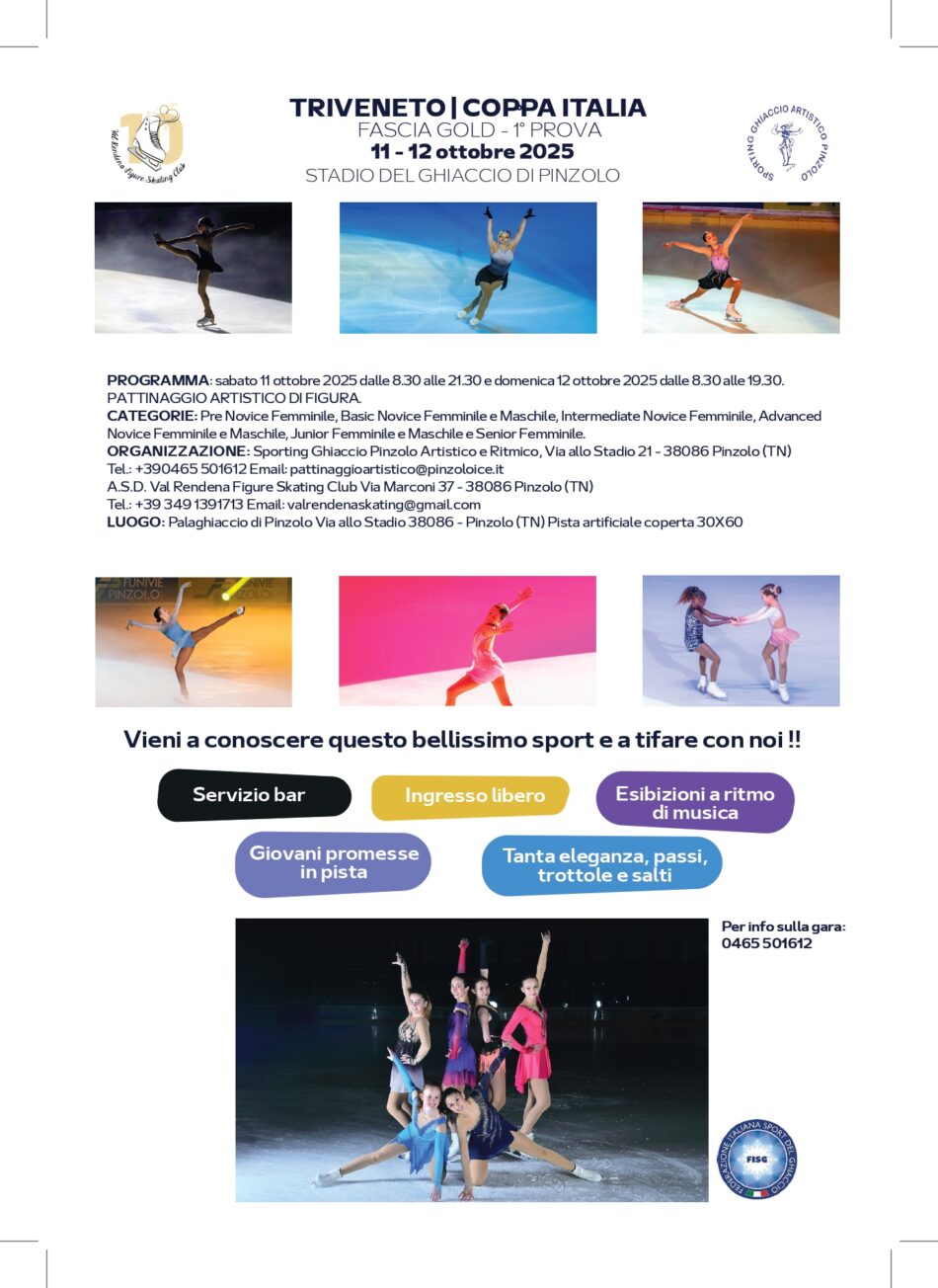 Sabato 11 e domenica 12 ottobre 2025 a Pinzolo presso lo stadio del ghiaccio si svolgerà la manifestazione di pattinaggio artistico TRIVENETO COPPA ITALIA FASCIA GOLD 1^ PROVA organizzata dalle due associazioni di pattinaggio locali, il Val Rendena Figure Skating Club e lo Sporting Ghiaccio Artistico Pinzolo.