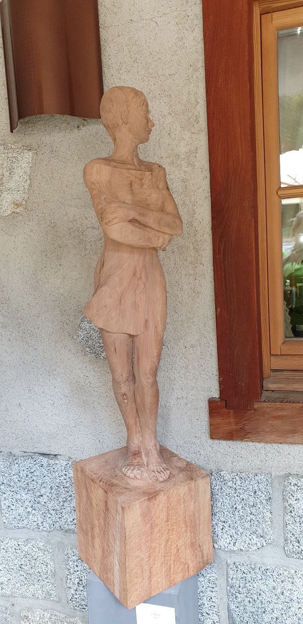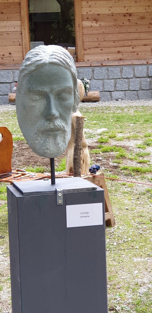 Un saggio di alcune opere esposte : giovane in legno di melo/ pattinatrice in legno di tiglio /busto in marmo scafoide del frate della Val di Breguzzo/ volto in arenaria verde di fiume …. e tante altre ancora…. da visitare ….e per chi non riuscirà  a salire, sarà l’autrice ad esporre alcuni pezzi alla mostra in allestimento  al Paladolomiti di Pinzolo.