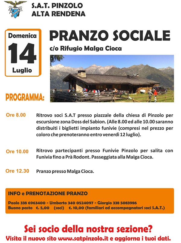 • 14 luglio: Pranzo socialle Sat alla Malga Cioca