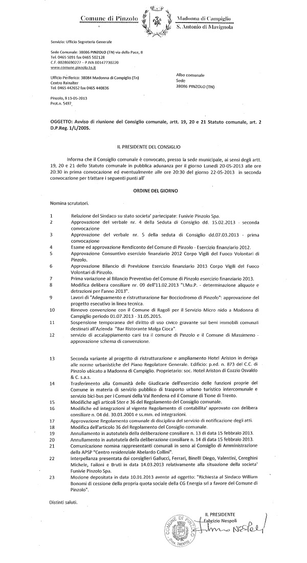 • 20 maggio: Convocazione del Consiglio comunale di Pinzolo