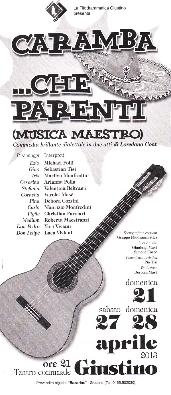 La Filodrammatica di Giustino è lieta di presentara la commedia brillante in due atti "CARAMBA.. CHE PARENTI!!" ( musica maestro ) di Loredana Cont e riadattata da Dorotea Masè! L’appuntamento è per il 21/27/28 aprile alle ore 21.00 presso il teatro comunale!! Prevendita biglietti "Bazarino" – Giustino