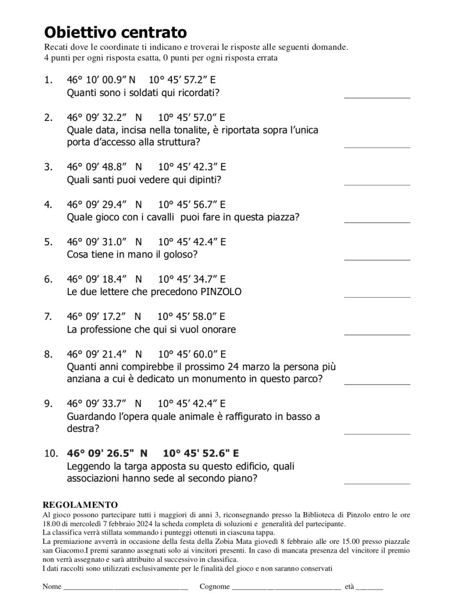 Il gioco si sviluppa in 3 parti: Vero o falso, ossia una serie di domande attinenti i vari aspetti del paese di Pinzolo dalla storia alla geografia, dal dialetto alla grastronomia… a cui rispondere semplicemente un vero o falso. Nel  secondo gioco, grazie all’abilità informatica di Giovanni Ricciardi, il volto di alcuni quadri famosi è stato sostituito con quello di alcuni residenti sta nell’abilità del giocatore individuare chi sono i 7 pinzolesi che si sono prestati come modelli. Infine Obiettivo centrato! Il terzo gioco. Qui vengono indicate delle coordinate di latitudine e longitudine che individuano dei punti precisi del paese. Solo recandosi sul posto è possibile trovare la soluzione ai quesiti proposti.