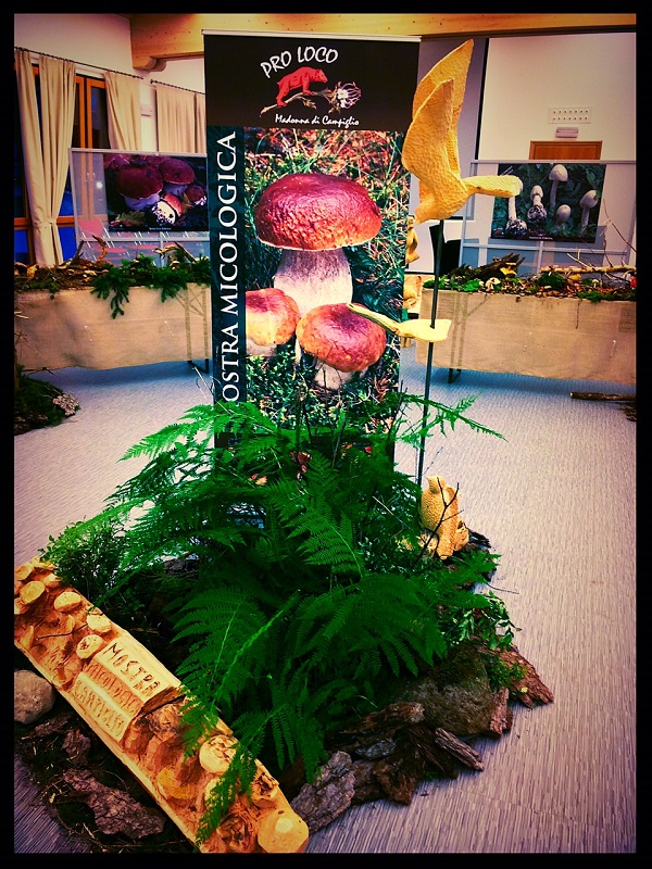 Anticonvenzionale e suggestivo l’allestimento, curato dall’ azienda Tradizioni e Fiori di Madonna di Campiglio, che riproduce con gusto e creazioni innovative l’ambientazione boschiva delle pendici del Brenta ed utilizza alcune sculture in legno del concorso artistico appena concluso, per accostare ai funghi i materiali ed i colori tipici dell’area dolomitica.