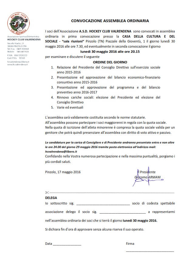 HC VALRENDENA Convocazione assemblea 2015-2016