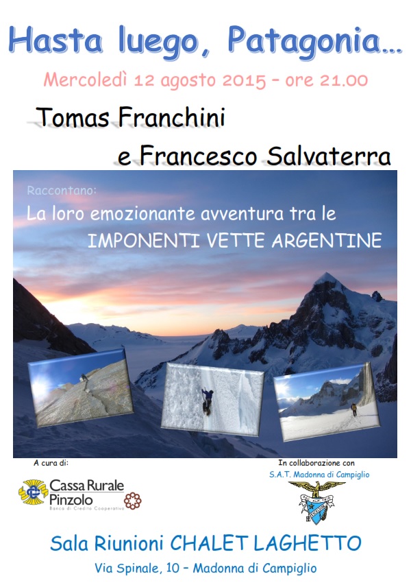 La Cassa Rurale di Pinzolo ha il piacere di invitarvi alla serata dal titolo “Hasta Luego, Patagonia…” che si terrà in data mercoledì 12 agosto 2015 presso la sala al primo piano dello Chalet Laghetto di Madonna di Campiglio ad ore 21.00 durante la quale i giovani Franchini Tomas e Salvaterra Francesco ci racconteranno la loro avventura tra le celebri vette argentine.