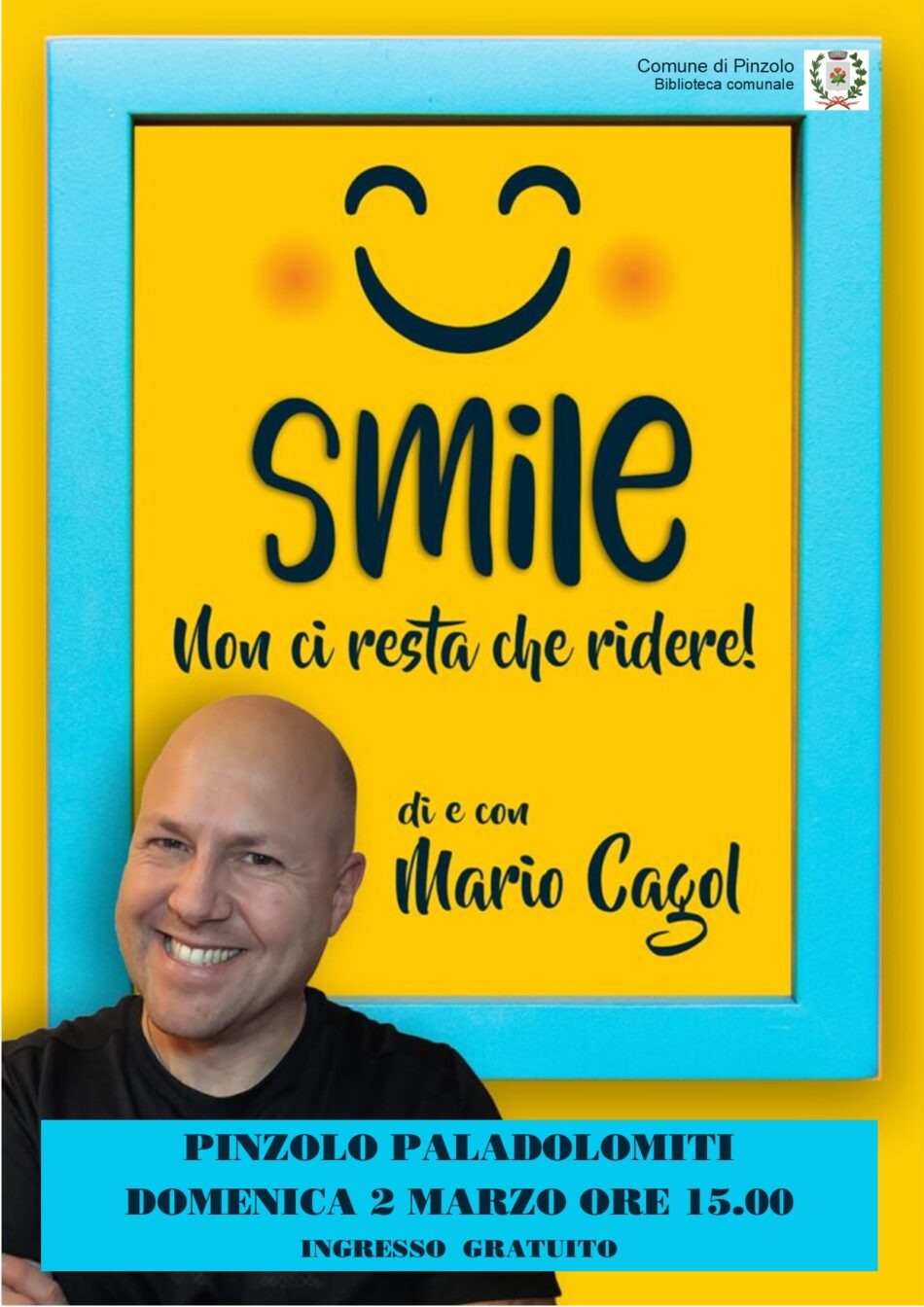 Non c’è carnevale senza allegria e senza risate e nulla è più adatto di uno spettacolo brillante intitolato Smile proposto dal comico trentino Mario Cagol. Tutti sono invitati, l’ingresso è gratuito. E’ sufficiente presentarsi domenica 2 marzo poco prima delle 15.00 per trascorrere un frizzante pomeriggio assistendo ad un divertente show.