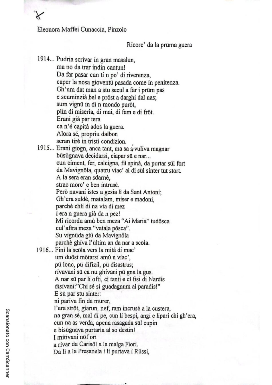 Poesia “Ricorc’ da la prüma guera”