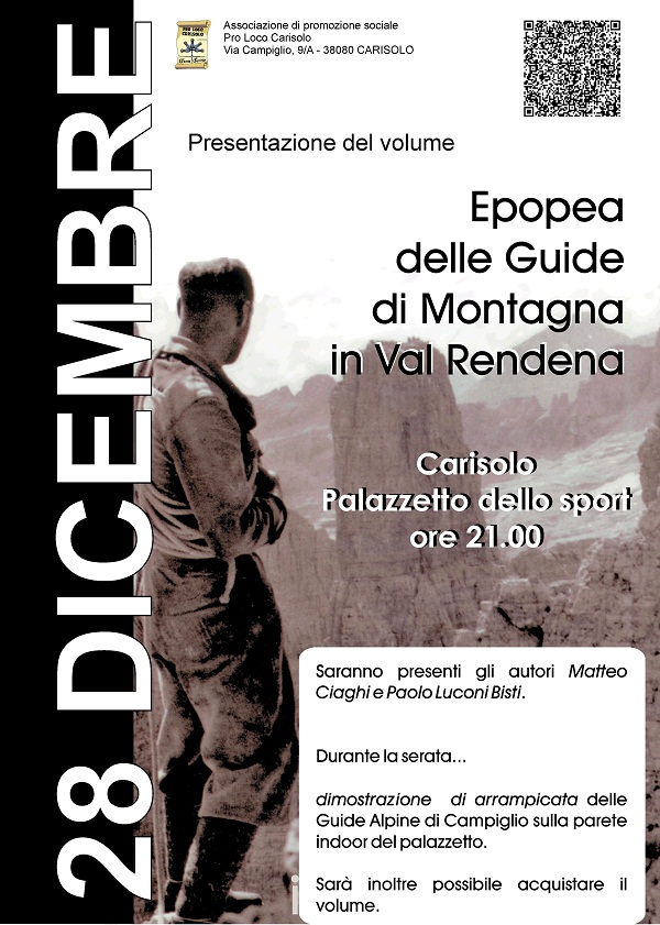 Mercoledì 28 dicembre presso il palazzetto dello sport di Carisolo ad ore 21.00 ci sarà la presentazione del libro “Epopea delle guide di montagna in Val Rendena”. Nel corso della serata si terrà una dimostrazione di arrampicata sulla parete di roccia indoor e sarà possibile acquistare il volume. Vi aspettiamo numerosi!!!